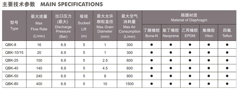 ■ 產(chǎn)品概述QBK氣動隔膜泵是我公司開發(fā)的第三代氣動隔膜泵,具有使用壽命長,不會停頓等優(yōu)點,它既能抽送流動的液體,又能輸送一些不易流動的介質(zhì),具有自吸泵、潛水泵、屏蔽泵、泥漿泵和雜質(zhì)泵等輸送機(jī)械的許多優(yōu)點。
